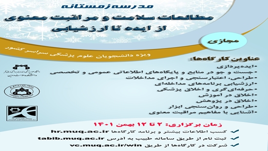 مدرسه زمستانه مطالعات سلامت و مراقبت معنوی از تاریخ 2 تا 12 بهمن ماه به صورت کارگاه های مجازی برگزار می شود.
