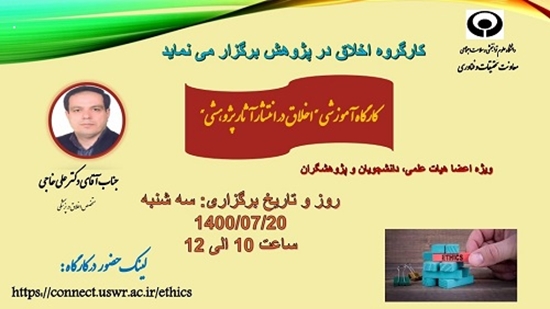 احتراما به استحضار می رساند کارگروه اخلاق در پژوهش در نظر دارد جهت توانمند سازی اعضاء محترم هيئت علمي و پژوهشگران و دانشجويان گرامي کارگاهی با عنوان "اخلاق در انتشار آثار پژوهشي" با ارائه جناب آقاي دكتر علي خاجي متخصص اخلاق در پزشكي در تاريخ سه شنبه 20 مهر 1400 از ساعت 10 الي 12 به صورت انلاین برگزار نماید. خواهشمند است شركت كنندگان با نام و نام خانوادگي كامل، شماره تماس و آدرس ايميل وارد شوند تا امكان صدور گواهي فراهم گردد.