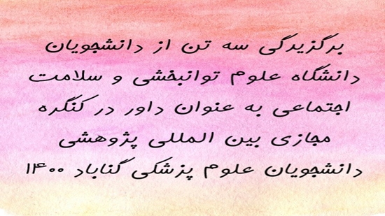 برگزیده شدن سه تن از دانشجویان دانشگاه علوم توانبخشی و سلامت اجتماعی به عنوان داور بیست و دومین کنگره مجازی بین المللی پژوهشی دانشجویان علوم پزشکی گناباد 1400