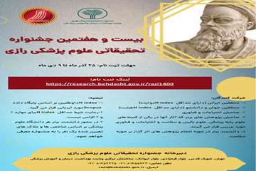 مهلت ثبت نام در بیست و هفتمین جشنواره تحقیقاتی علوم پزشکی رازی  25 آذر تا 9 دی‌ماه سال جاری است و علاقمندان می‌توانند جهت کسب اطلاعات بیشتر به وب سایت معاونت تحقیقات و فناوری وزارت بهداشت مراجعه کنند.