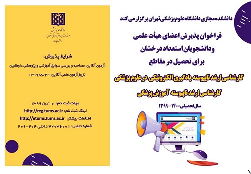 دانشکده مجازی دانشگاه علوم پزشکی تهران به عنوان قطب علمی یادگیری الکترونیکی در علوم پزشکی این امکان را دارد که به عنوان دانشکده مجری ظرفیت محدودی از پذیرش دانشجو را به اعضای محترم هیات علمی و دانشجویان استعداد درخشان دانشگاه های سراسر کشور اختصاص دهد،و بر همین اساس در مقطع کارشناسی ارشد ناپیوسته در دو رشته "یادگیری الکترونیک در علوم پزشکی" و "آموزش پزشکی" از طریق مصاحبه و بدون نیاز به شرکت در آزمون کتبی دانشجو می پذیرد. ثبت نام به صورت آنلاین و از طریق لینک http://reg.tums.ac.ir انجام می شود. آزمون عملی به صورت آنلاین در تاریخ ۱۳۹۹/۰۵/۲۲ برگزار خواهد شد. برای اطلاع از کوریکولوم این رشته می توانید به سایت http://etums.tums.ac.ir مراجعه فرمایید. در صورت نیاز به کسب اطلاعات بیشتر با شماره تلفن ۴۲۰۳۶۰۰۱ داخلی ۲۰۶-۲۰۴ تماس حاصل فرمایید.