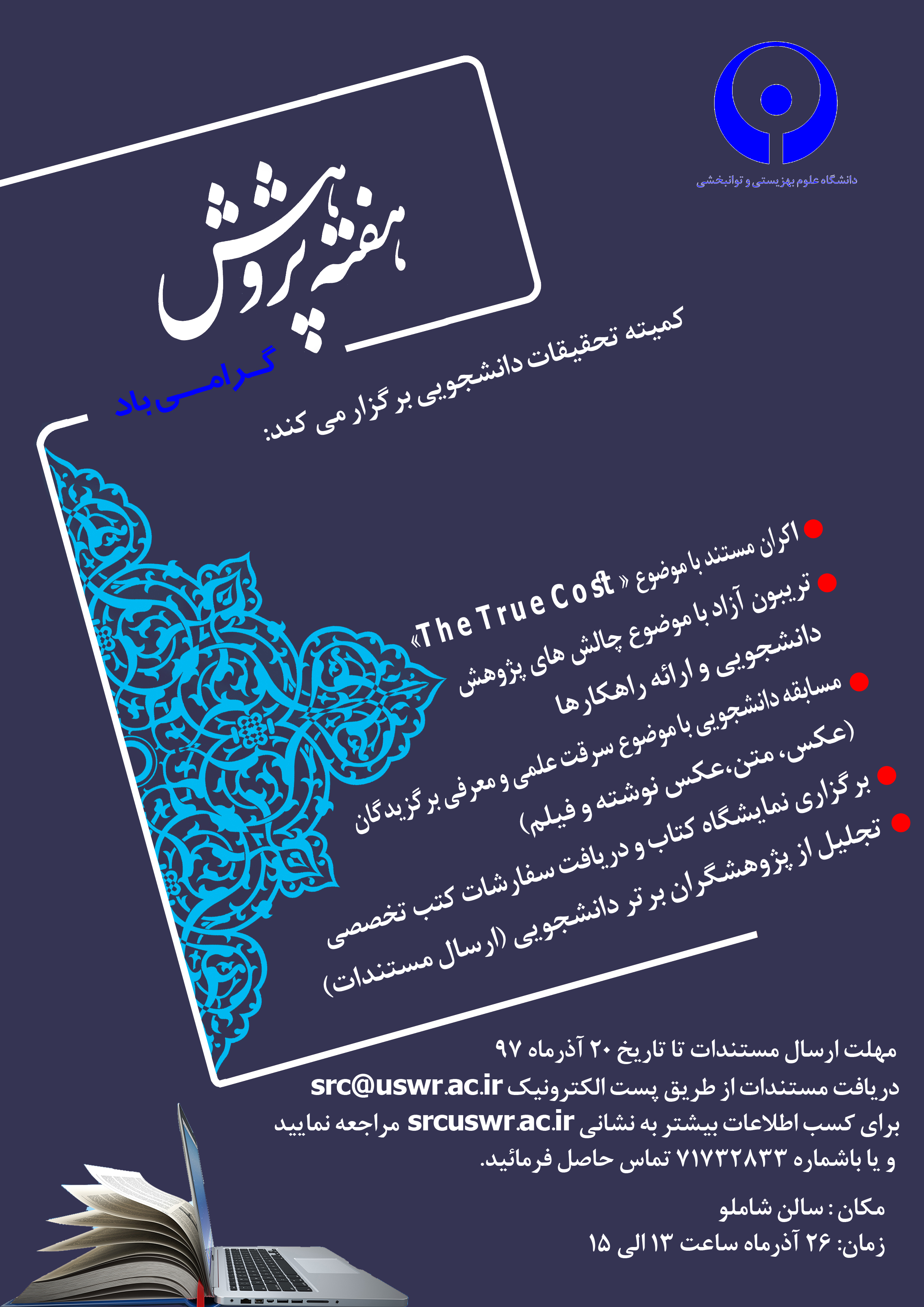 کمیته تحقیقات دانشجویی دانشگاه، مراسم "هفته پژوهش" را با برنامه های متنوع و مشارکت همه دانشجویان برگزار می کند.