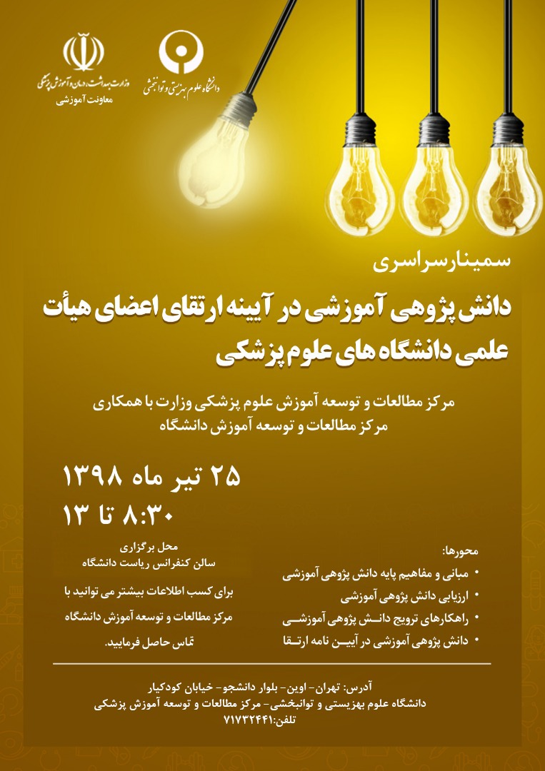 سمینار سراسری " دانش پژوهی آموزشی در آیینه ارتقای اعضای هیات علمی " دانشگاه های علوم پزشکی، فردا (سه شنبه - 25 تیرماه) در سالن اجتماعات حوزه ریاست دانشگاه علوم بهزیستی و توانبخشی برگزار می شود.