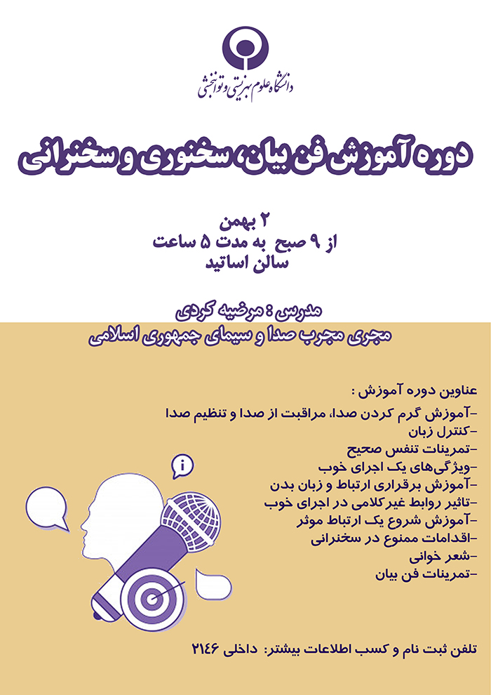 دوره آموزشی « فن بیان، سخنوری و سخنرانی »، روز چهارشنبه (دوم بهمن ماه) از ساعت 9 صبح به همت روابط عمومی دانشگاه علوم بهزیستی و توانبخشی، در سالن اساتید (ساختمان غدیر) دانشگاه برگزار می‌شود.