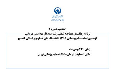 اخبار > اطلاعیه شماره 2 - برنامه زمانبندی مصاحبه شغلی رشته مددکار بهداشتی درمانی آزمون استخدام پیمانی 1398 دانشگاه های علوم پزشکی کشور