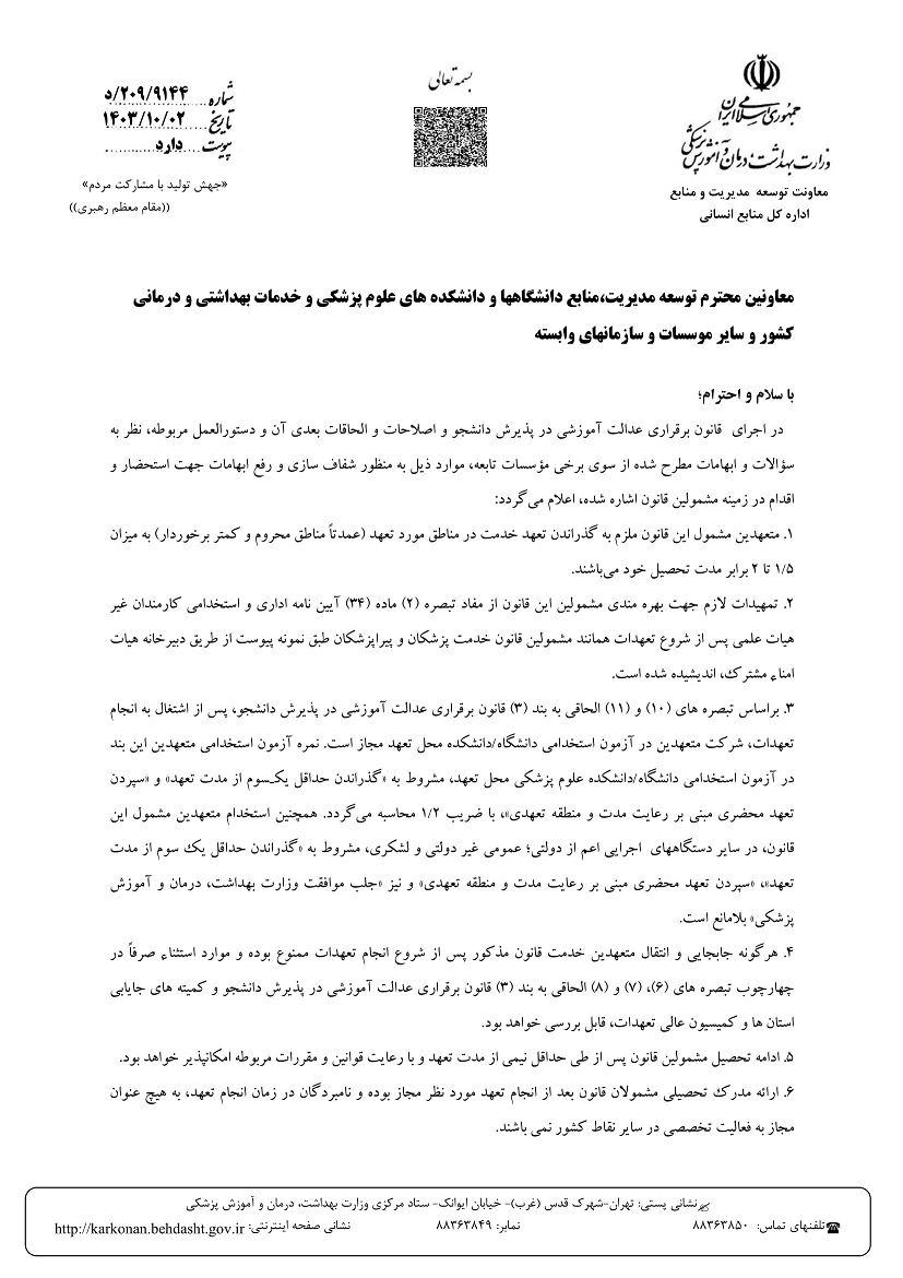 اخبار > بخشنامه -شفاف سازي و رفع ابهامات مربوط به مشمولين قانون برقراري عدالت آموزشي / تمامي موسسات |