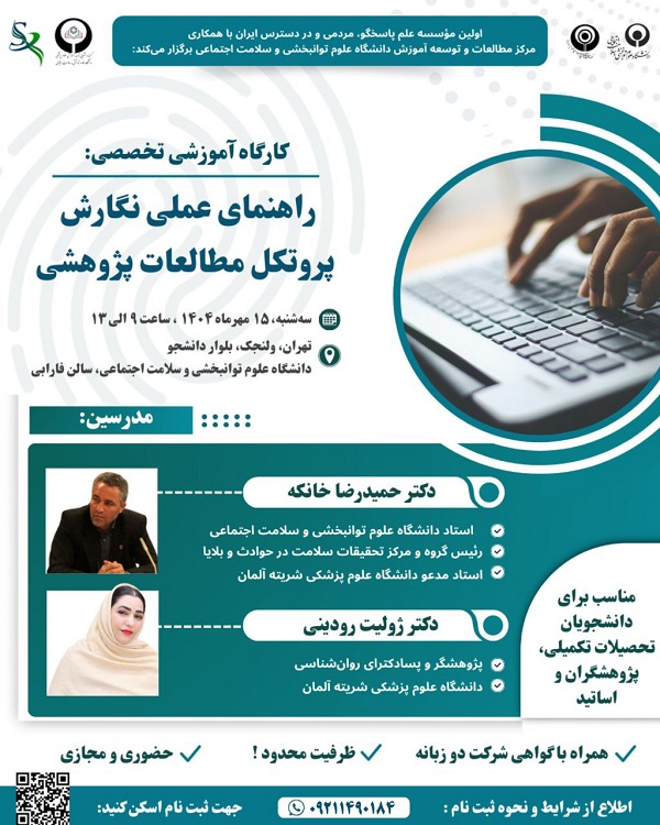 کمیته تحقیقات و فناوری دانشجویی دانشگاه علوم توانبخشی و سلامت اجتماعی برگزار می کند کارگاه آموزشی تخصصی راهنمای عملی نگارش پروتکل مطالعات پژوهشی با همکاری مرکز مطالعات و توسعه آموزش، کمیته تحقیقات دانشجویی و کمیته دانشجویی توسعه آموزش علوم پزشکی دانشگاه علوم توانبخشی و سلامت اجتماعی برگزار میکند مدرسین: 1404/07/03 - ١١:٣١ / شماره خبر : ٢٩٥٤٥ / تعداد نمایش : 58 خروج |
