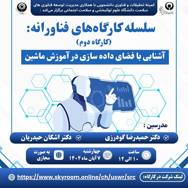 کمیته تحقیقات و فناوری دانشجویی دانشگاه علوم توانبخشی و سلامت اجتماعی برگزار می کند سلسله کارگاه های فناورانه: کارگاه دوم آشنایی با فضای داده سازی در آموزش ماشین مدرس: جناب آقای دکتر حمیدرضا گودرزی، جناب آقای دکتر اشکان حیدری
