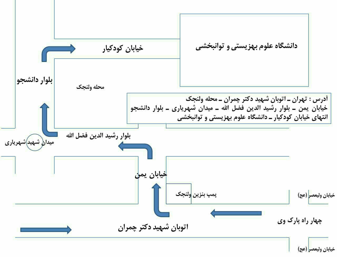 • دانشگاه علوم توانبخشی و سلامت اجتماعی تهران، اوین، بلوار دانشجو، بن بست کودکیار(آدرس در نقشه گوگل)